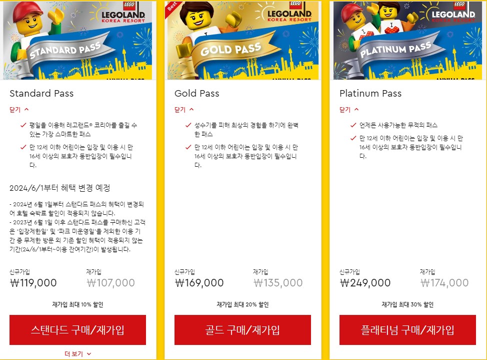 그리고 스탠다드 패스를 이용하시는 분들께는 레고랜드 코리아 호텔 숙박료를 10% 할인받을 수 있는 혜택이 있습니다. 다만, 일부 사용불가일이 있으며, 다른 할인 프로모션과 중복으로 사용할 수 없습니다. 이 점을 유의해 주시기 바랍니다.