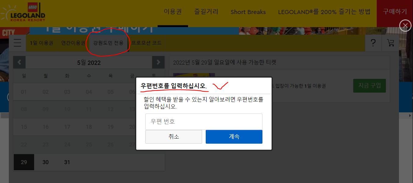 강원도민은 홈페이지를 통해 예매할 때 예매창에 우편번호를 입력하면 강원도민 할인예매로 자동 적용되기 때문에 우편번호를 입력하는 것을 잊지 마시고, 강원도민 할인예매의 편리함과 혜택을 최대한 활용해 보세요.