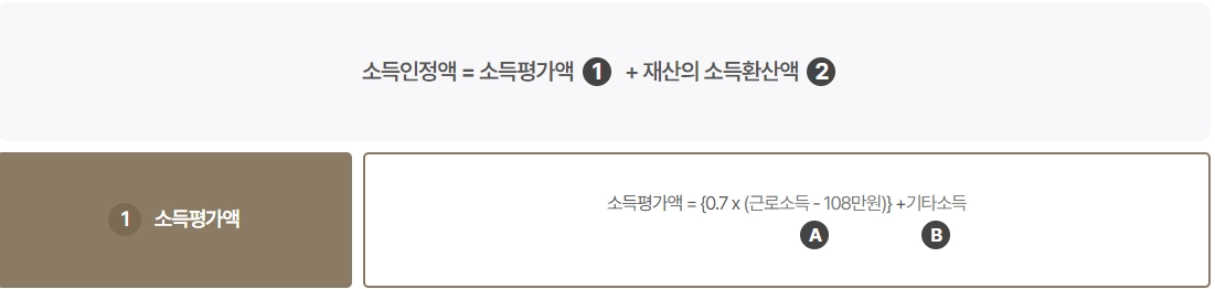 - 소득평가액 = {0.7 X (근로소득 - 108만 원)} + 기타 소득