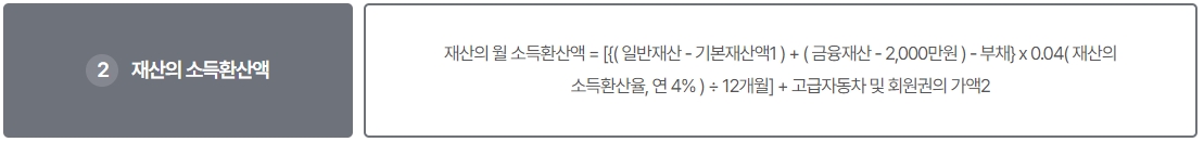 - 재산의 소득환산액 = [{(일반재산 - 기본재산)+(금융재산-2,000만 원)-부채} x 연 소득환산율(4%) / 12월] + P