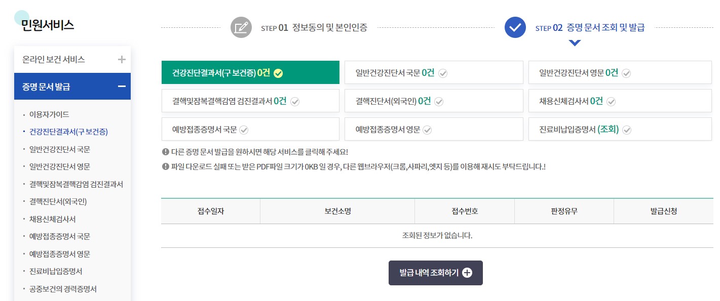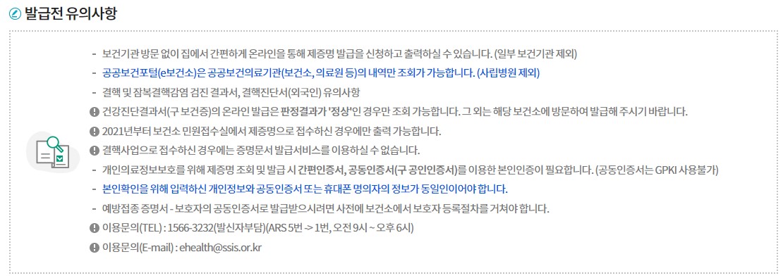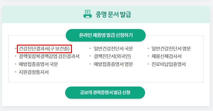 이 사이트에서는 보건증 외에도 채용 신체검사서, 예방접종 증명서, 결핵 진단서, 결핵 및 잠복결핵감염 검진 결과서, 진료비 납입 증명서를 발급할 수 있다고 합니다. 단 사립병원은 조회가 불가능하며, 병원이나 보건소 등의 내역만 조회할 수 있으니 이 점도 참고해 주세요.