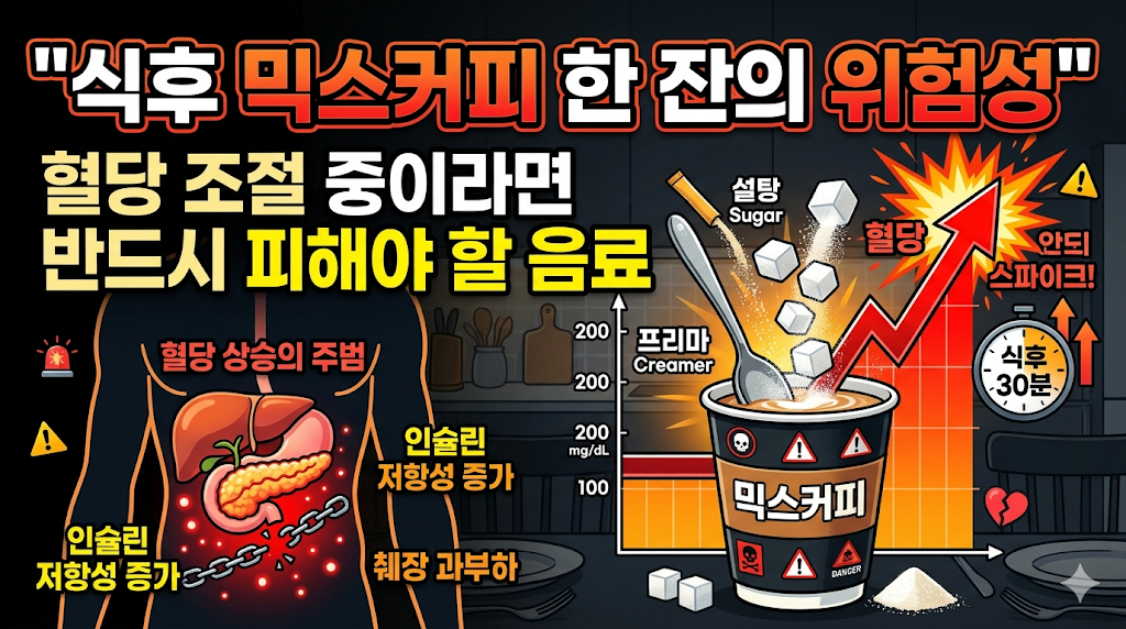 우리나라 직장인과 어르신들의 최고의 기호식품 중 하나인 믹스커피. 맵고 짠 음식을 먹은 뒤 마시는 달달한 믹스커피는 소위 ‘단짠단짠’의 완성이지만, 혈당 관리 중인 분들에게는 가장 위험한 유혹입니다. 단순히 '설탕' 때문만이 아닙니다. 믹스커피 속 성분들이 어떻게 우리 몸의 인슐린 시스템을 망가뜨리는지 분석해 드립니다.
