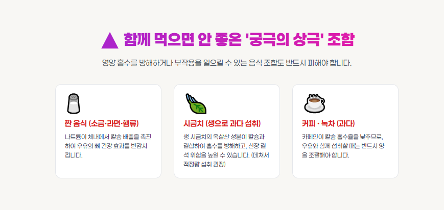 🚫 짠 음식(소금·라면·햄류): 나트륨이 칼슘 배출을 촉진
