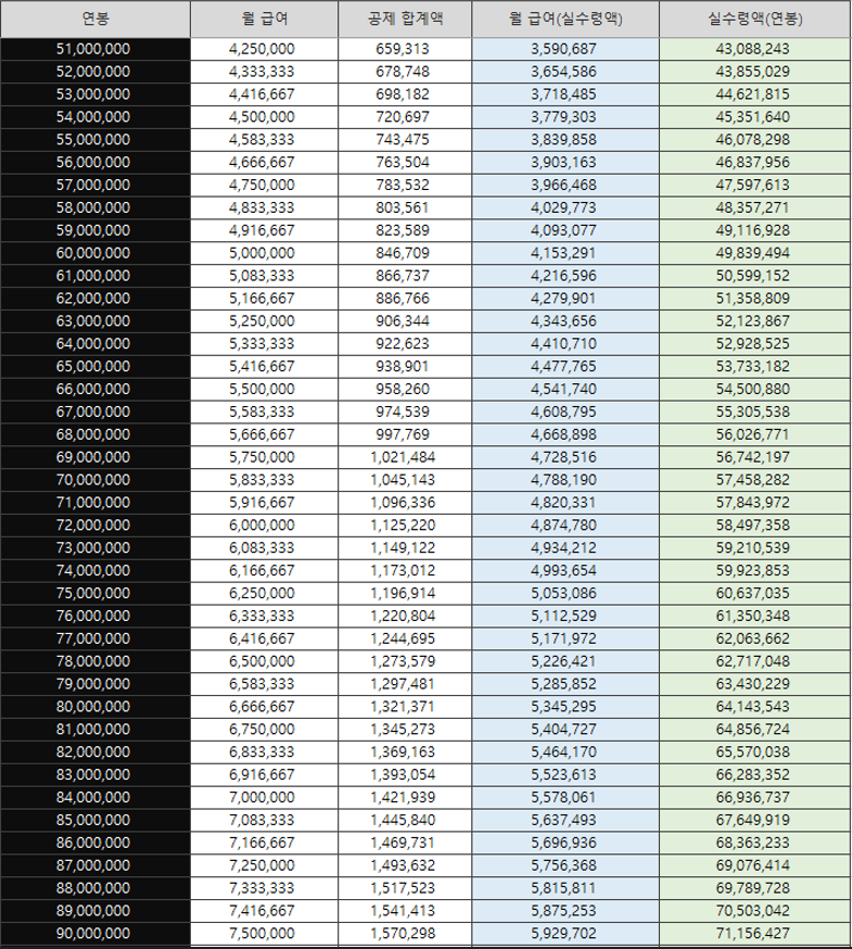 2023년 연봉실수령액 표