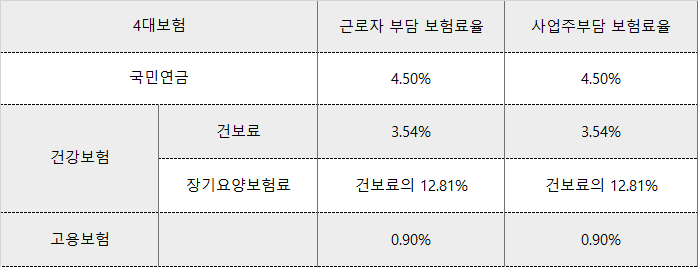 고용보험은 7월부터 0.9%로 인상되어 이전의 0.8%보다 높아졌습니다. 국민연금, 건강보험, 고용보험은 사업주와 근로자가 반반씩 부담하므로 앞서 언급한 비율에 따라 세금을 납부하게 됩니다.