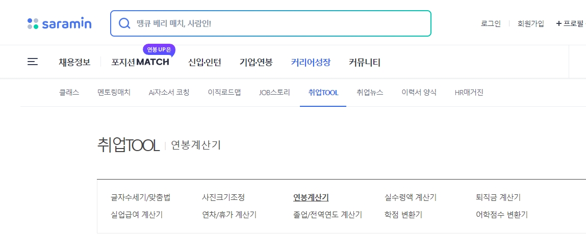 카테고리 안에는 커리어성장에 자소서 코칭, 취업 TOOL 등의 다양한 툴이 있습니다. 취업 TOOL에 우리가 확인하고자 하는 연봉 계산기를 선택합니다.